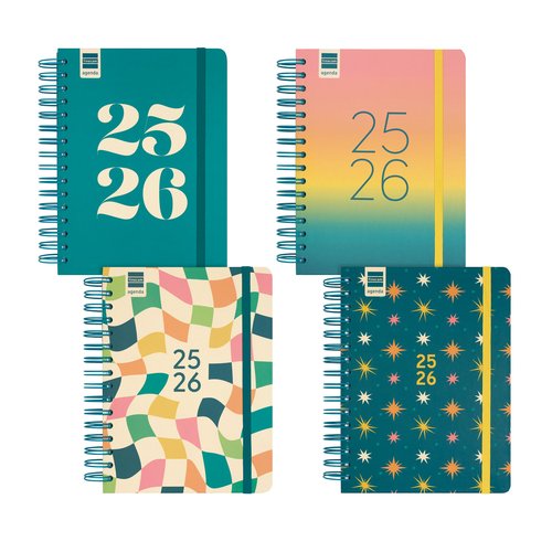 AGENDA ESCOLAR (2025-26) FINOCAM CATALAN COSMO WIRE-O tapa EXTRA D/P 4º 155x212 con GOMA ASSORTIMENT PACK de 4